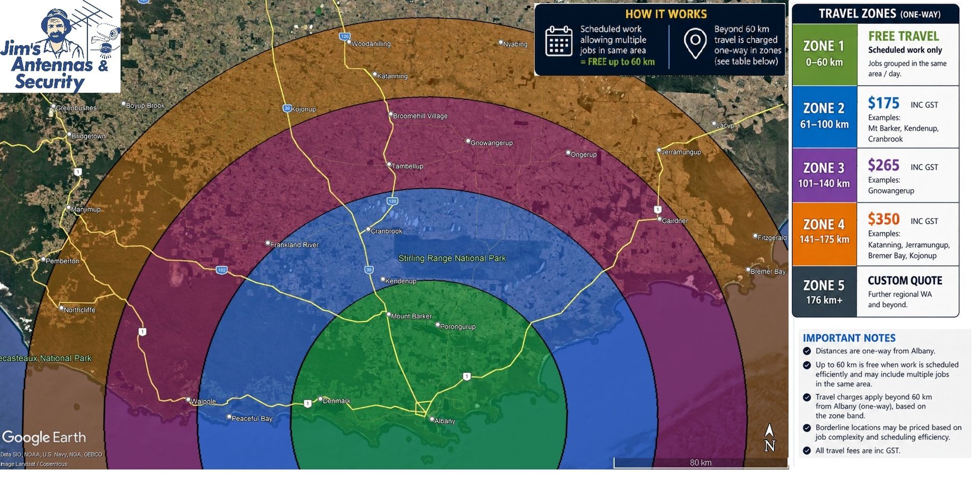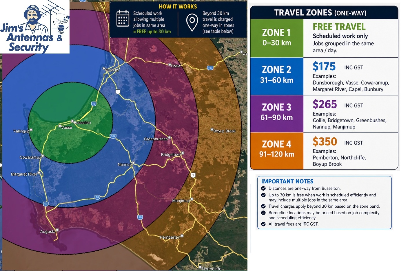 Distances are one-way from the selected base. Free travel applies only when work is scheduled efficiently and may include multiple jobs in the same area. Borderline locations may be priced based on job complexity and scheduling efficiency. All travel fees shown are inc GST.